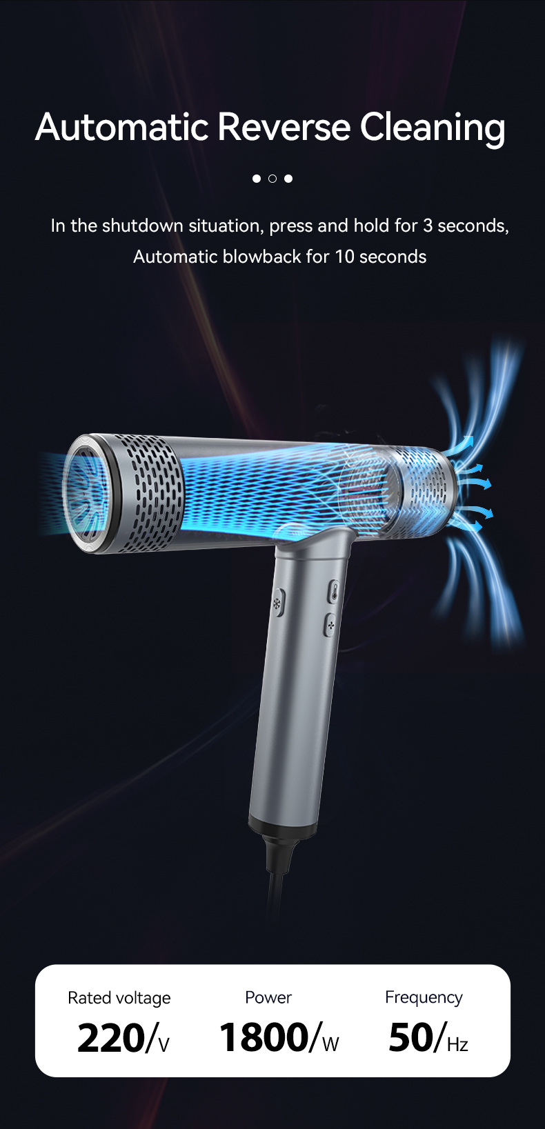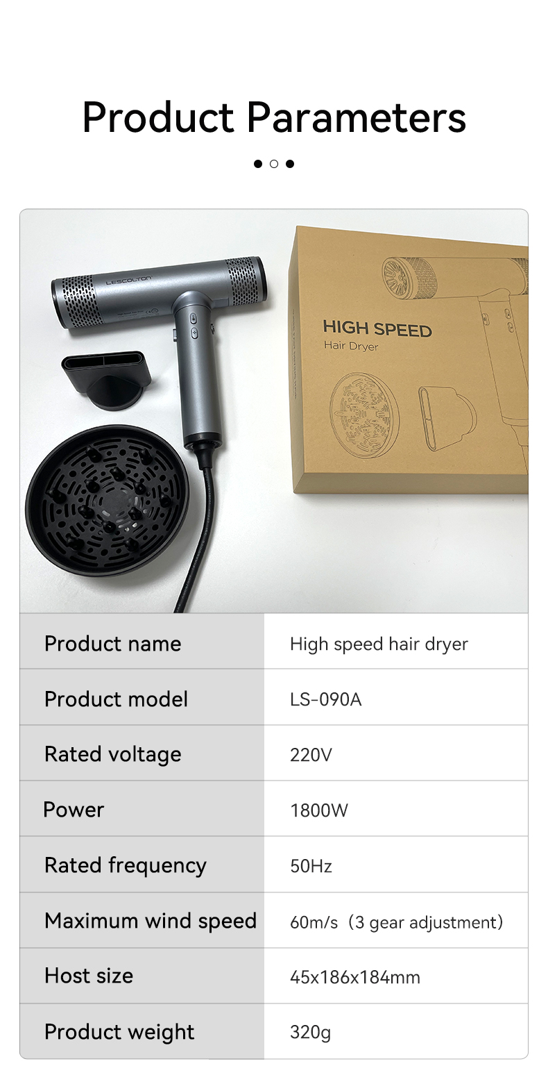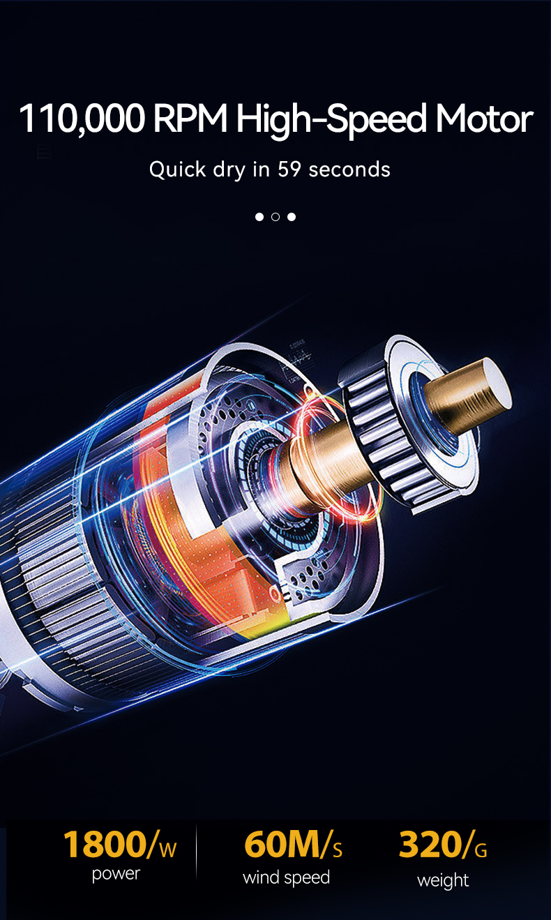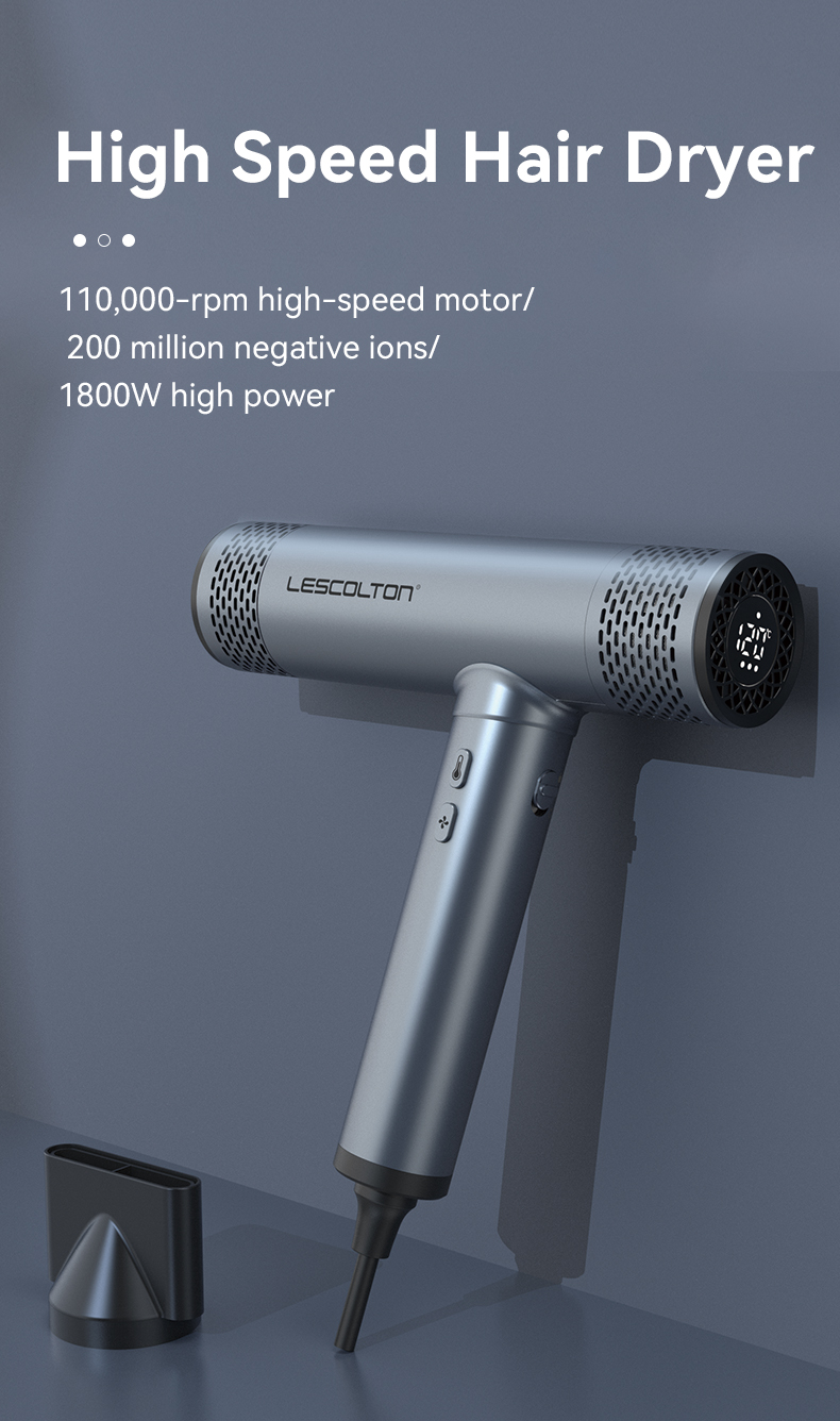 110,000 RPM Brushless Motor for Super-Fast Drying – The Lescolton high-speed hair dryer features a powerful 1,800-watt brushless motor, delivering a strong airflow of 60 meters per second. Even thick, long hair dries quickly, saving you half the drying time. Furthermore, its noise level is only 78 decibels, eliminating annoying motor noise.