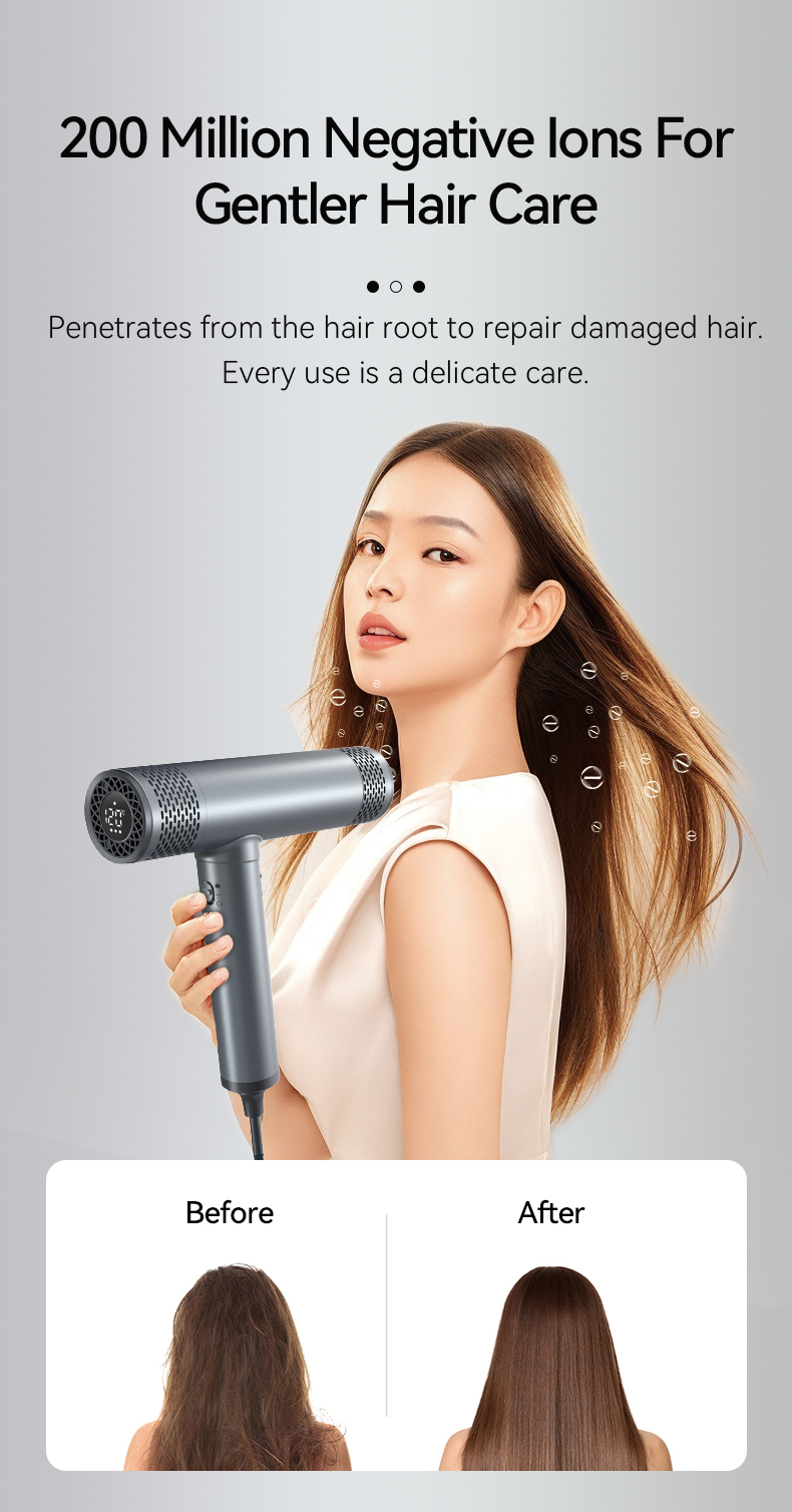 Precise Temperature Control and 200 Million Negative Ions for Soft Hair – The Lescolton professional hair dryer features an advanced T-type sensor that monitors and adjusts the heat from the air outlet, ensuring even and precise heating while preventing damage to hair from overheating. In addition, during the drying process, millions of negative ions are carried by the airflow to the hair, leaving it silky smooth and frizz-free.