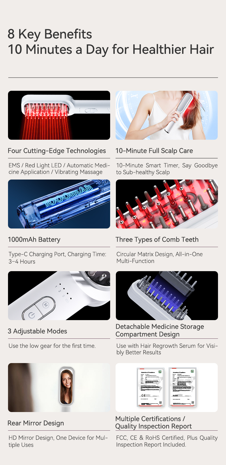 1. 10ML capacity liquid tank, you can add polymer water- such as essential oils, hair growth embrocation, nutrient result, etc., and spot continuously for 6- 8 twinkles, so that the hair can be moisturized, stationary electricity, and odors can be removed, making the hair softer and healthier.
